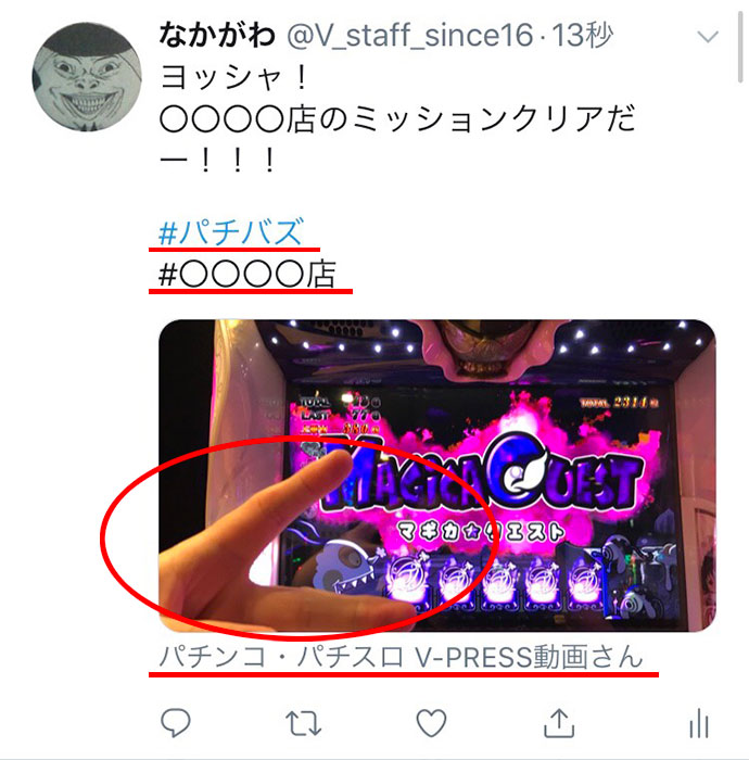 - 文末に『#パチバズ』と『#開催店舗』『V-PRESSアカウントをタグ付け』をつけている方のみV-PRESSアカウントでリツイートをさせてもらいます。